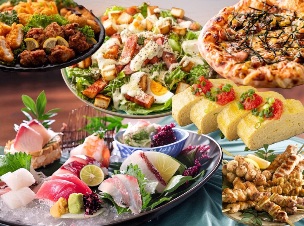 みんなで取り分けて楽しむ大皿料理スタイル。刺身や焼き鳥、サラダなどを中心に、
